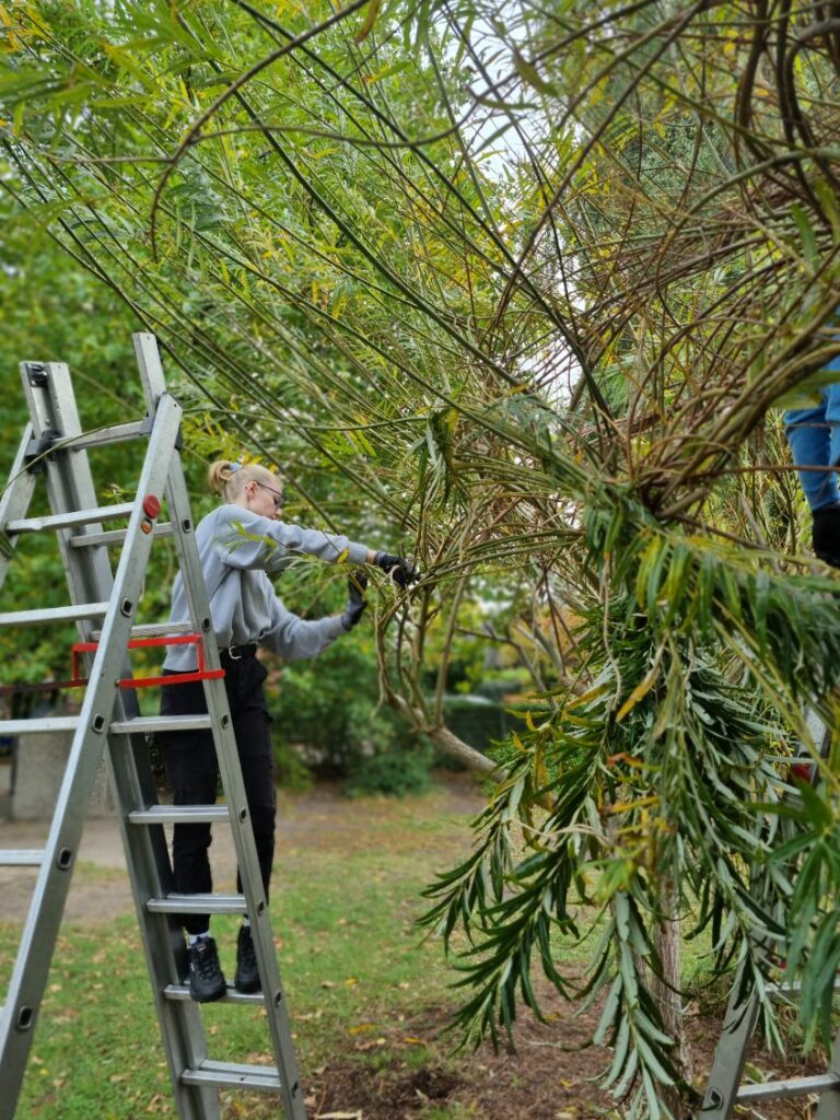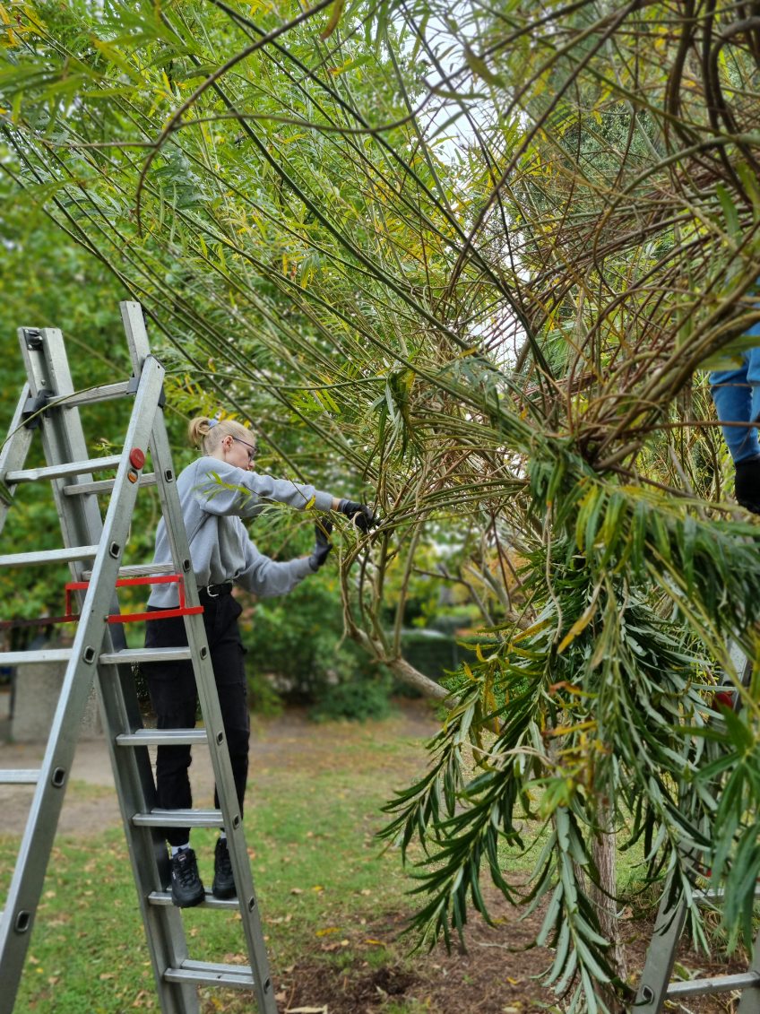 Mit viel Energie wurden die Hochbeete entkrautet und winterfest gemacht, Baumteller freigelegt und die Staketenzäune ordentlich im Keller verstaut. Auch die Wildstaudenpflanzungen zwischen den Gräsern erhielten eine gründliche Pflege. Ein besonderes Highlight war der Weidentunnel, der geschnitten und neu gebunden wurde und nun wieder stabil und einladend wirkt.