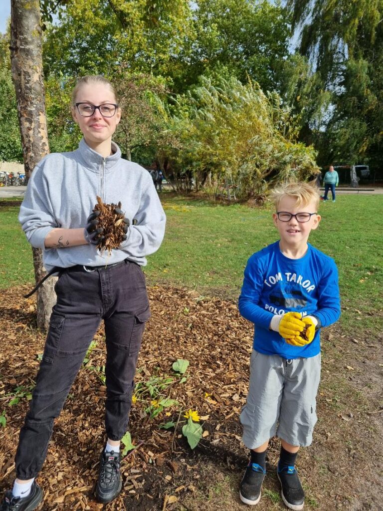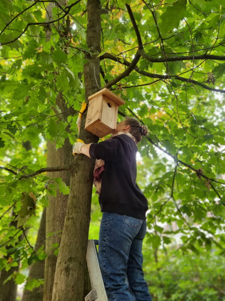 In diesem Jahr gab es außerdem eine zusätzliche Aufgabe: Die Vogelhäuser und Nistkästen, die beim Umwelttag im Frühjahr entstanden waren, mussten endlich ihren Platz auf dem Schulgelände finden. Mit großer Freude wurden sie aufgehängt und bieten nun neuen Lebensraum für gefiederte Besucher.